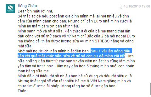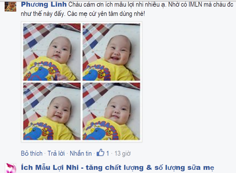 “…Bé bú không xuể, mỗi lần bé ti nuốt ọc ọc mình thấy vui lắm, xì ra mạnh, bắn thành tia luôn ý ạ ^^ Sữa em giống như sữa Vinamilk bình mình hay uống ý, đặc lắm, sữa trắng hơn trước, nghe nhiều mẹ nói là dùng Ích Mẫu Lợi Nhi sữa mẹ đặc như sữa Ngôi sao ý. Giờ em đang dùng tới hộp thứ 6 rồi, em sẽ dùng liên tục để có sữa về cho con…”