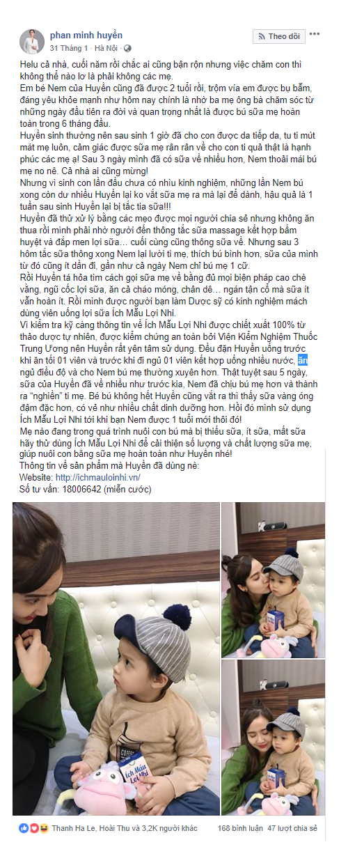 Đến giờ, khi Nem đã 2 tuổi rồi, Huyền Lizzie vẫn không quên gửi lời cảm ơn tới Ích Mẫu Lợi Nhi. Vì đã sinh con, nên cô hiểu rõ vai trò tuyệt vời của sữa mẹ, trên các cộng đồng Bỉm sữa, rảnh cái là Huyền Lizzie lại mách nước cho các mẹ thiếu sữa, mất sữa dùng viên Lợi sữa Ích Mẫu Lợi Nhi để sữa được tràn trề, con no nê khỏe mạnh nha!