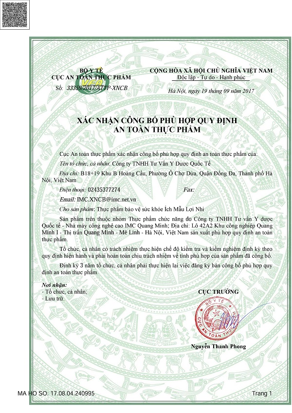 - Được sản xuất bởi Công ty TNHH tư vấn y dược quốc tế (IMC), Nhà máy đạt tiêu chuẩn GMP (GMP - Good Manufacturing Practice-Thực hành sản xuất thuốc tốt).