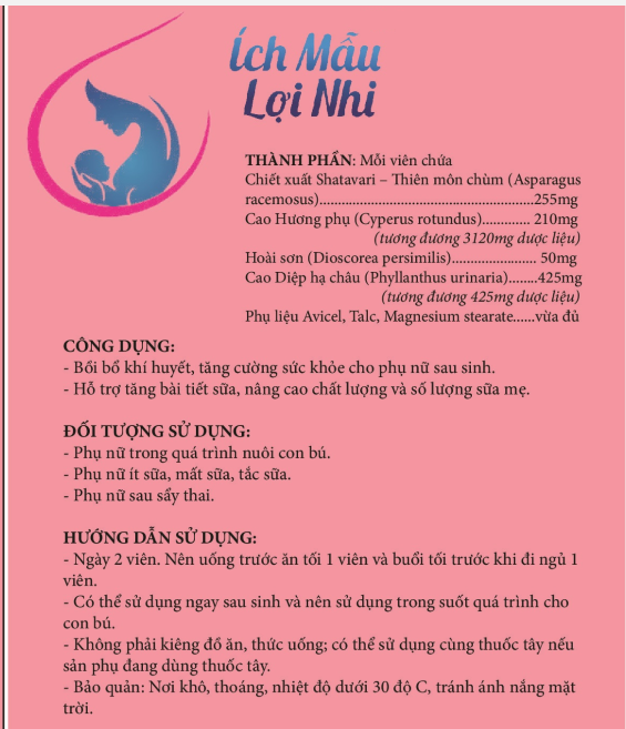 Đối với mẹ mới sinh giúp mẹ khỏe mạnh hơn: giúp cơ thể mẹ hành khí hành huyết, đẩy nhanh sản dịch, phục hồi sức khỏe sau sinh nhờ thành phần Hương Phụ có trong Ích Mẫu Lợi Nhi. Ngoài ra thành phần Hoài Sơn có tác dụng kiện tỳ vị sẽ giúp mẹ ăn ngon, ngủ ngon hơn, da dẻ hồng hào.